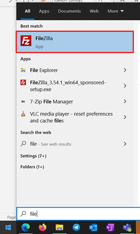 - After installed, open FileZilla on your machine. Example for Windows 10, typing FileZilla on your search or start box