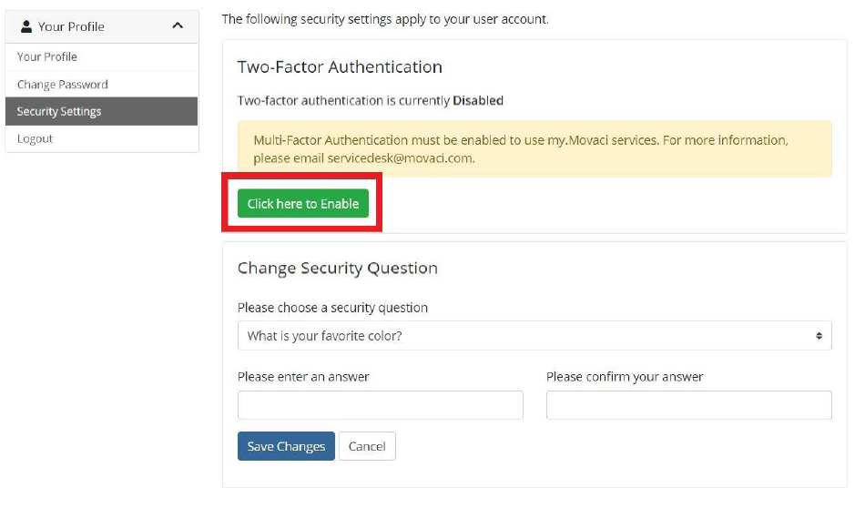 1. คลิ้กที่ปุ่มสีเขียว " Click here to Enable " เพื่อเปิดใช้งาน Two Factor Authentication